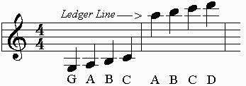 Ledger Lines: The lines which extend the range of the staff to indicate